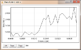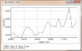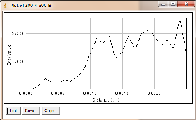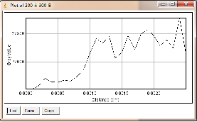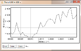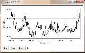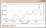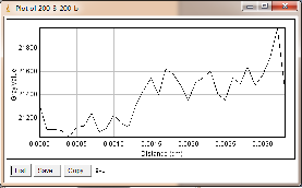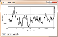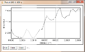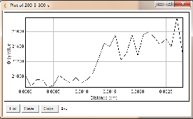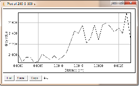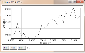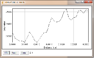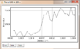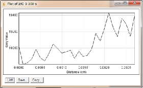 当大焦点(1.0mm)改为小焦点(0.4mm),其他参数保持不变时,如图3-6为对比灵敏度试块表面整体的灰度变化情况,图3-7为对比灵敏度试块上2%孔的灰度变化情况,其上方图像是对应的对比灵敏度试块的DR成像分析图,使用ImageJ软件处理,在对比灵敏度试块的数字图像表面上画根线,得到了灰度的性变化图(如图3-6),可以判断出大概在对比灵敏度试块的2%孔上灰度差百分比在20%左右,然后在用ImageJ软件在对比灵敏度试块的2%孔上画根线,得到了它的灰度变化情况(如图3-7)