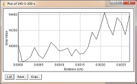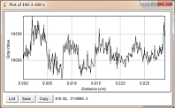 第二组对比:曝光条件,管电压为200kV,积分时间300,小焦点,如图3-16和3-17分别是管电流为3mA和4mA时对比灵敏度试块的2%孔灰度变化情况,其上面的图是对应的DR数字图像,使用ImageJ软件处理,在对比灵敏度试块的2%孔画根线,得出其灰度变化情况