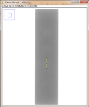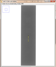 第一组对比:曝光条件,管电压为200kV,管电流为4mA,大焦点,如图3-18和3-19分别是积分时间为200ms和300ms时对比灵敏度试块的2%孔灰度变化情况,其上面的图是对应的DR数字图像,使用ImageJ软件处理,在对比灵敏度试块的2%孔画根线,得出其灰度变化情况