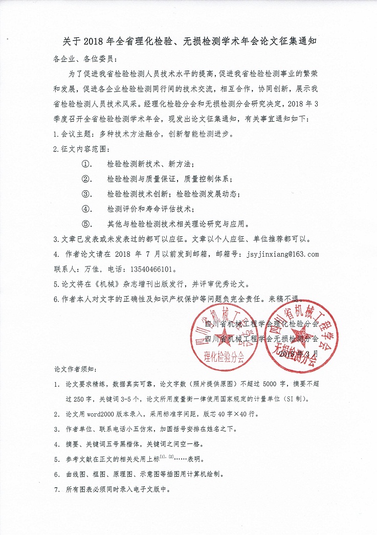 关于2018年全省理化检验、无损检测学术年会论文征集通知