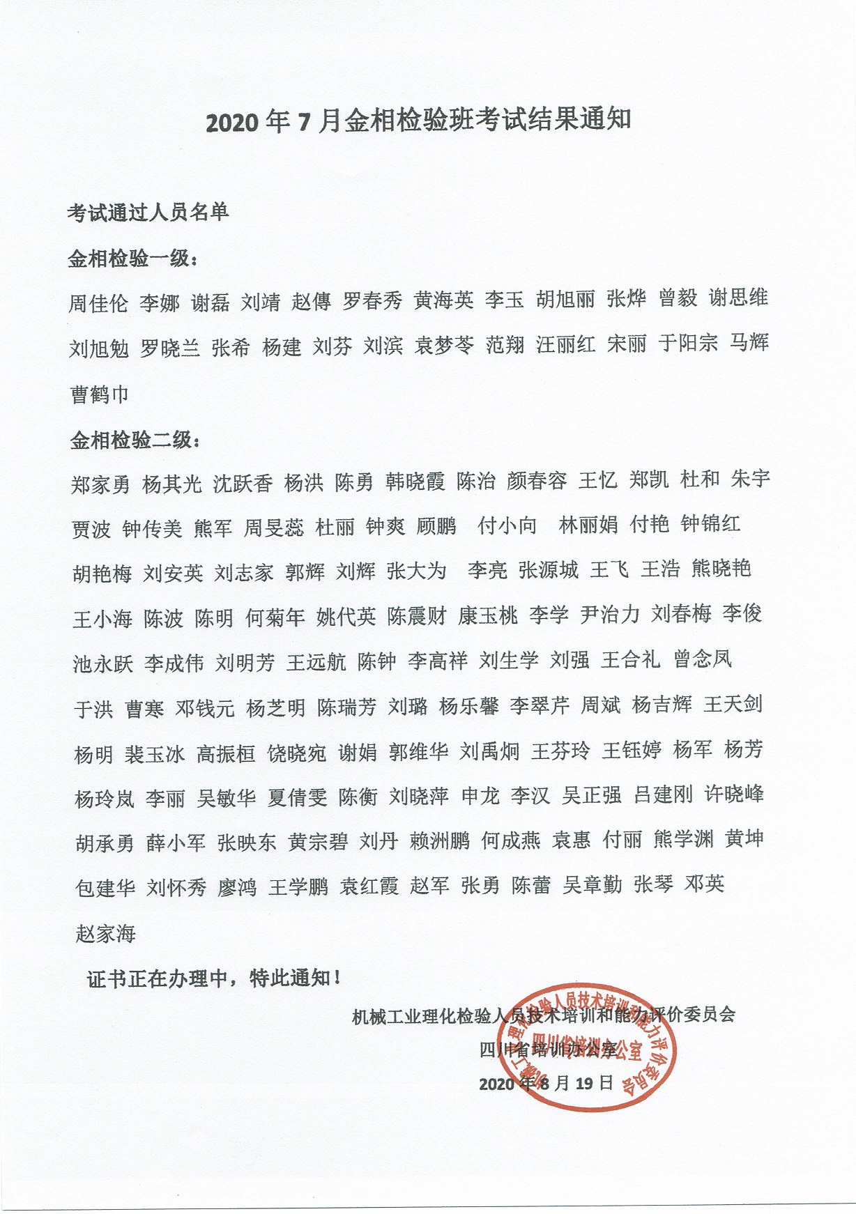 2020年7月金相检验班考试结果通知