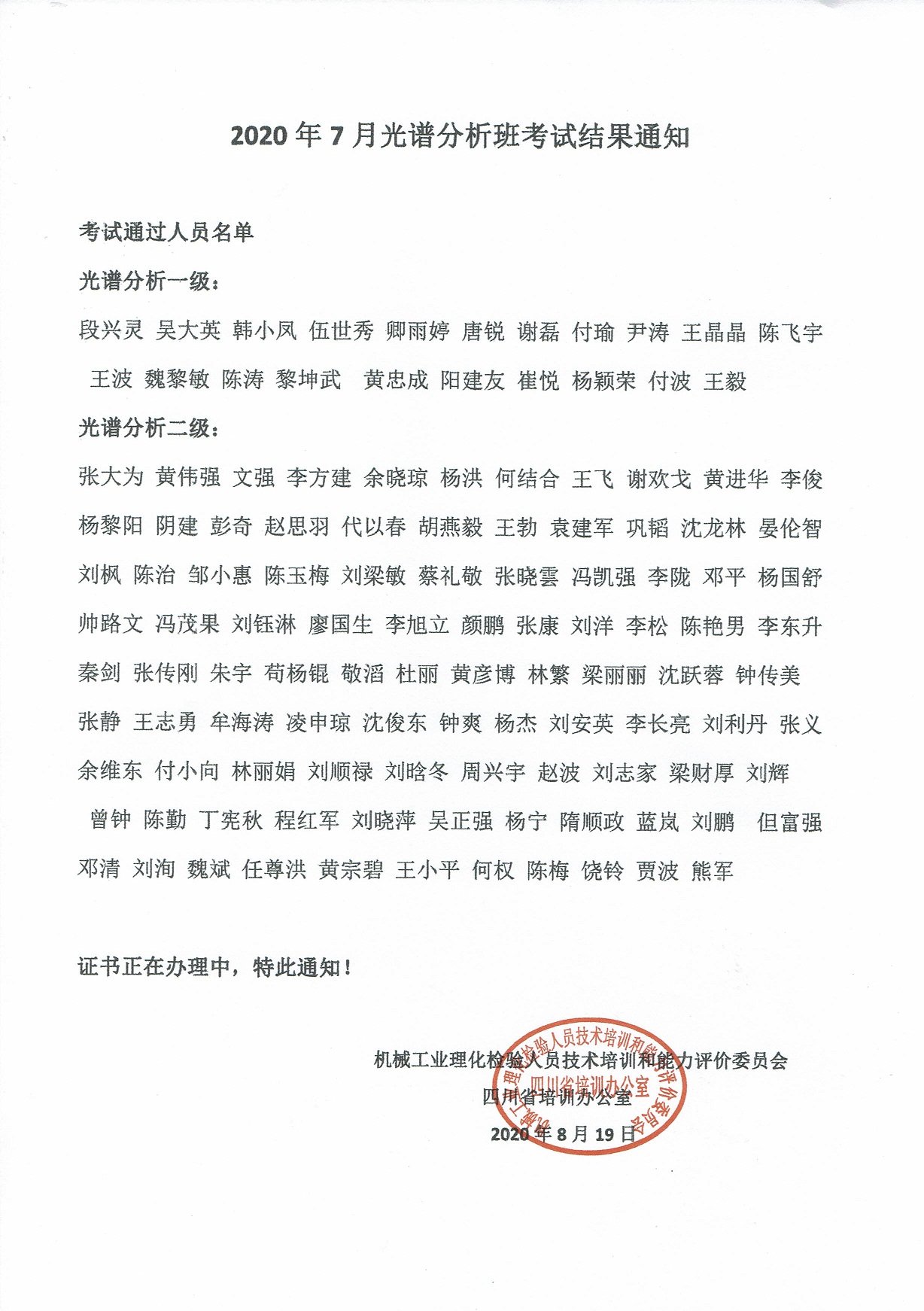 2020年7月化学分析考试结果通知