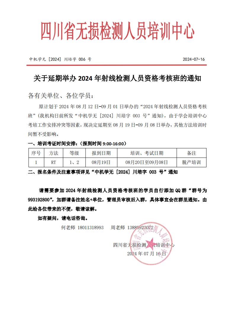中机学无【2024】川培字006号 关于延期举办2024年射线检测人员资格考核班的通知
