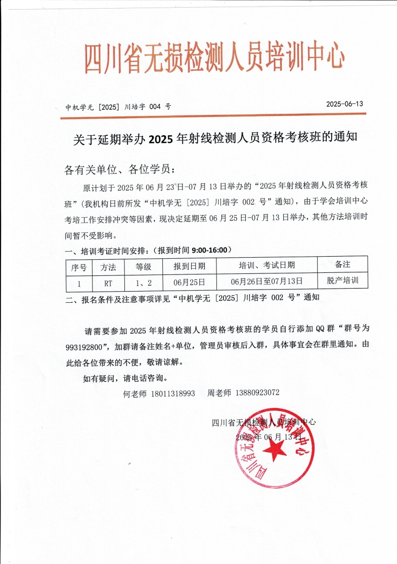 中机学无【2025】川培字004号 关于延期举办2025年射线检测人员资格考核班的通知(带章)
