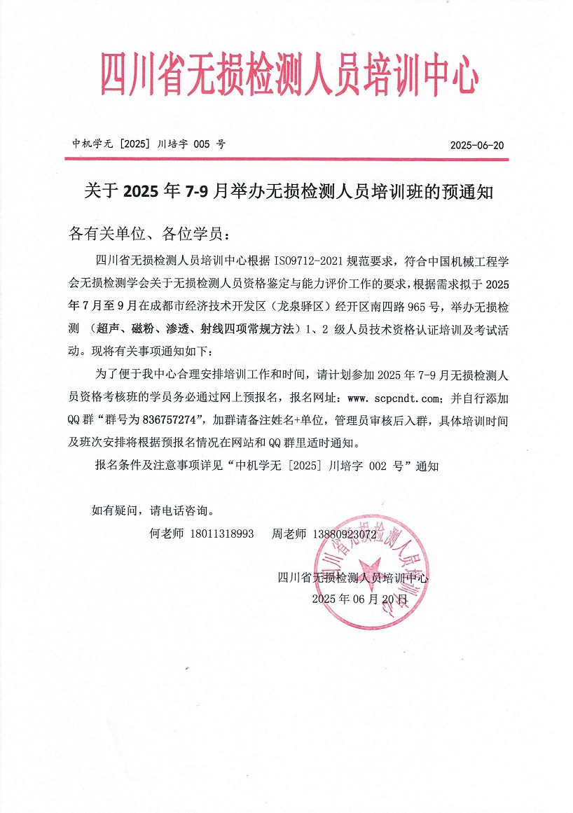 关于举办2025年7-8月无损检测人员资格考核班的预通知