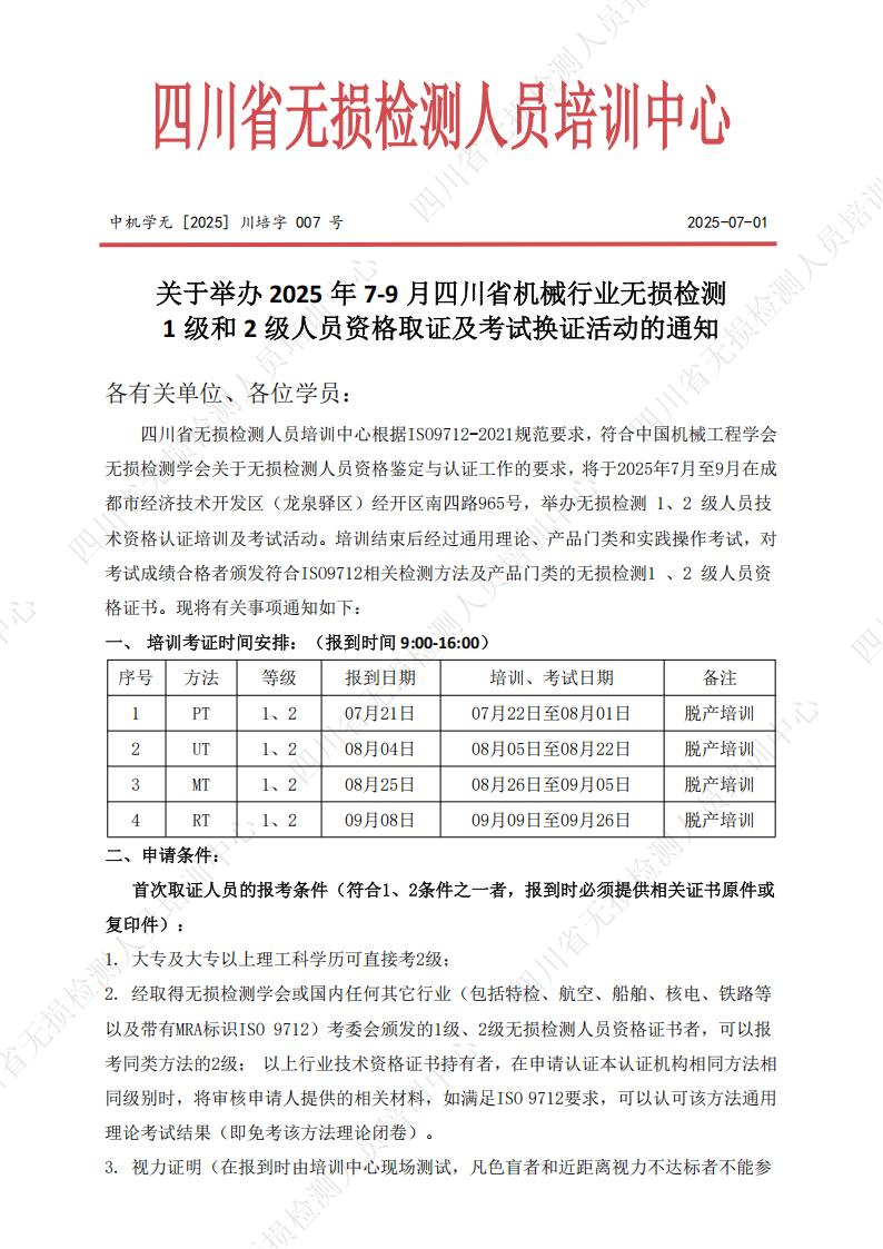 关于举办2025年7-9月四川省机械行业无损检测1级和2级人员资格取证及考试换证的通知